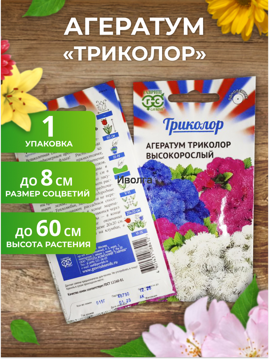 Агератум высокорослый "Триколор" - великолепная смесь сортов с невероятным парфюмерным ароматом в цветах национального флага! Растение из семейства Астровые, прямостоячее, ветвистое, высотой до 60 см. Цветение обильное с июня до заморозков. Душистые мелкие цветки собраны в плотные пушистые соцветия 5-8 см в диаметре. Агератум достаточно засухоустойчив, светолюбив, но может расти при небольшом затенении, предпочитает легкие, умеренно плодородные почвы. Теплолюбив, заморозков не переносит.
