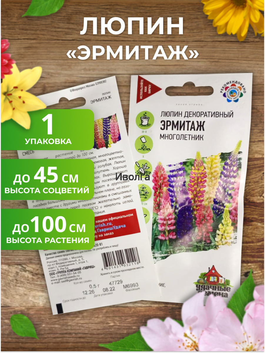 Люпин декоративный многолетник "Эрмитаж" - многолетнее растение из семейства Бобовые высотой до 100 см. Соцветие — длинная (до 45 см), плотная, многоцветковая кисть. Окраска соцветий: белая, кремовая, желтая, розовая, красная, фиолетовая, синяя и голубая. Люпин светолюбив, но выносит легкую полутень. Хорошо растет на любых нетяжелых почвах.