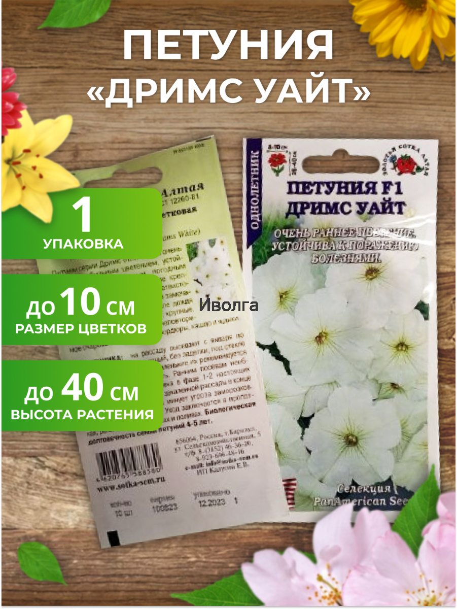 Петуния "Дримс Уайт F1" - петунии данной серии сочетают в себе очень раннее цветение с прекрасными большими цветками (8-12 см в диаметре), что делает их прекрасным материалом для украшения балконов, вазонов, а также для массовых ковровых посадок. Данная серия зарекомендовала себя более ранним началом цветения, по сравнению с другими сериями и высокой устойчивостью к непогоде. Белая окраска цветков в сочетании с бордово-алой окраской зева и прожилок порадует вас своей уникальностью и создаст незабываемое ощущение праздника.