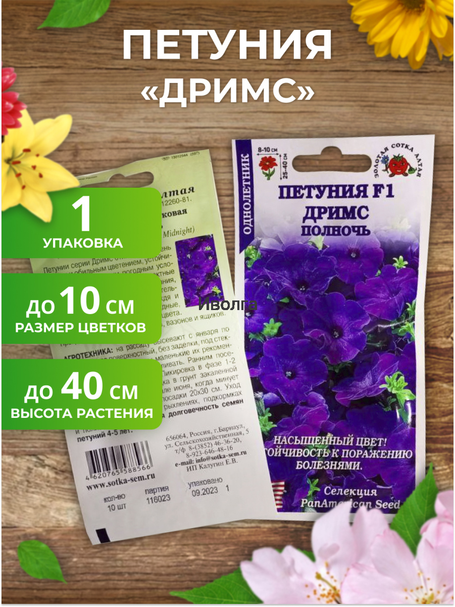 Петуния "Дримс F1" полночь - отличный выбор для создания потрясающих воображение живых цветочных "ковров" или многоярусных "водопадных" цветников. Уникальность этой смеси петунии в насыщенности и выровненности оттенков очень крупных цветков 8-11 см в диаметре. Куст компактной формы, плотный, хорошо облиственный, высотой 25-40 см, диаметром 25-30 см.Аккуратная форма куста сохраняется весь сезон, несмотря на сильные дожди и ветра.