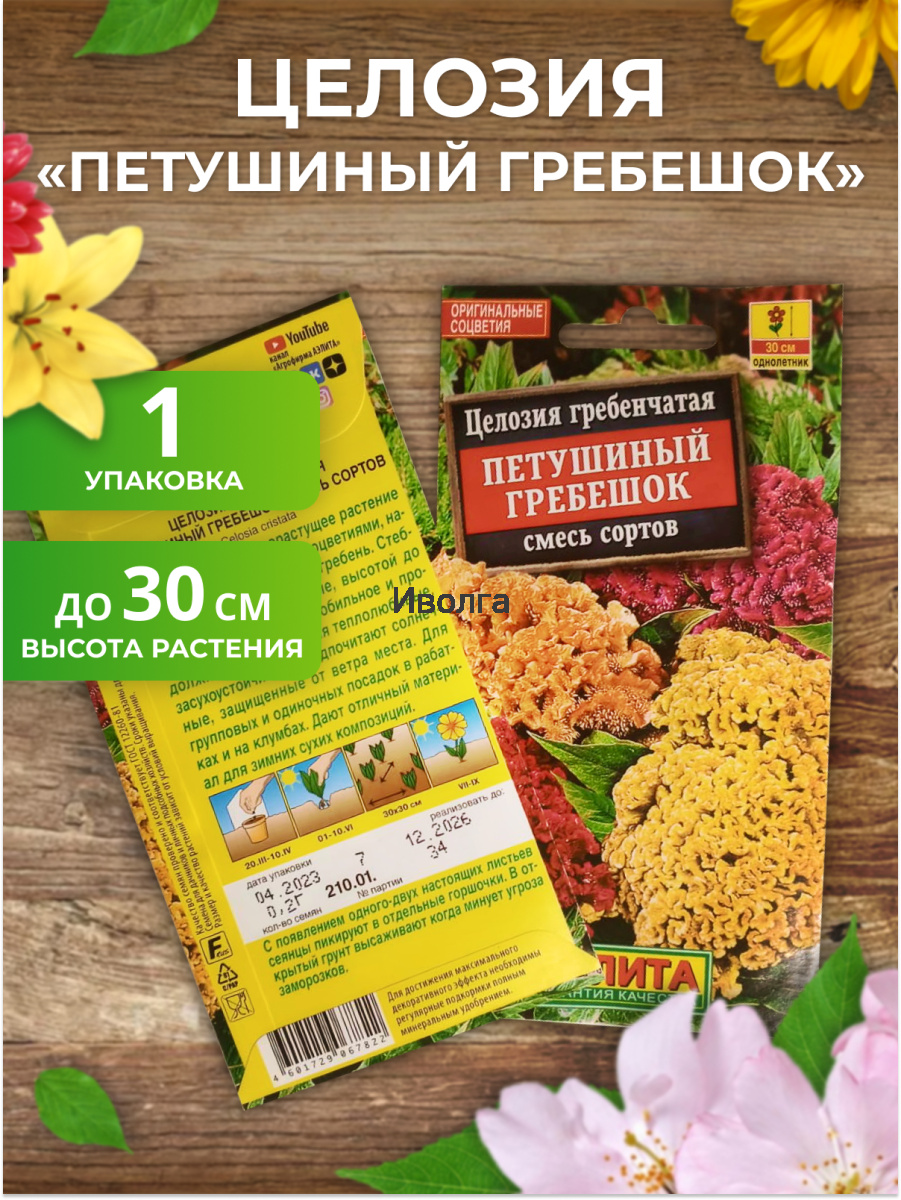 Целозия гребенчатая "Петушиный гребешок" смесь сортов - оригинальное быстрорастущее растение с плотными массивными соцветиями, напоминающими петушиный гребень. Стебли прямостоячие, мощные, высотой до 30 см. Цветение раннее, обильное и продолжительное. Растения теплолюбивые, засухоустойчивые, предпочитают солнечные, защищенные от ветра места. Для групповых и одиночных посадок в рабатках и на клумбах. Дают отличный материал для зимних сухих композиций.