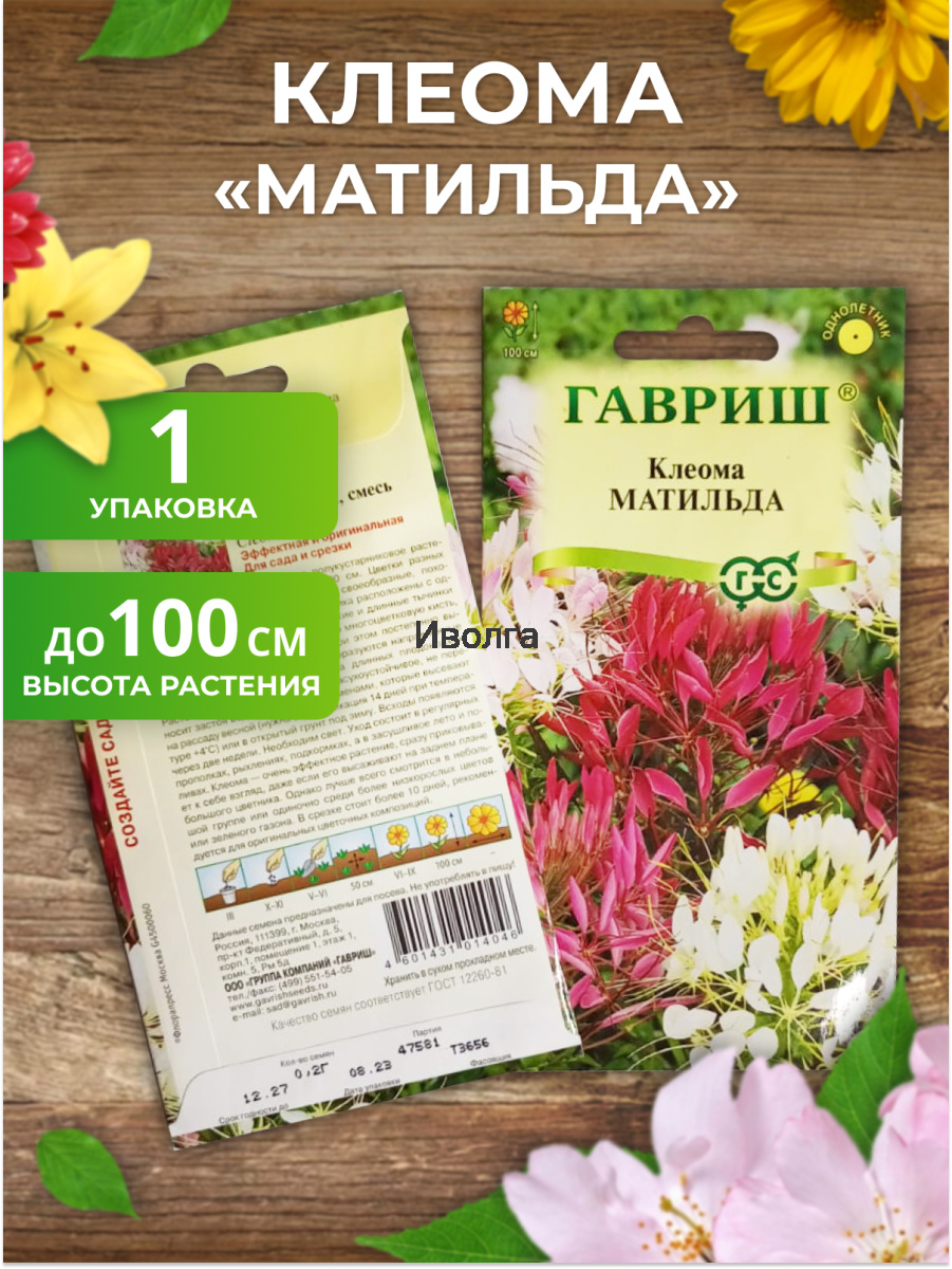 Клеома "Матильда" - однолетнее полукустарниковое растения высотой около 100 см. Цветки очень своеобразные, похожие на паучка - четыре лепестка венчика расположены с одной стороны цветка, а с другой - тонкие и длинные тычинки и столбик. Цветки собраны в конечную многоцветковую кисть, распускаются снизу вверх и кисть при этом постепенно вытягивается. Из отцветших цветков образуются направленные в стороны вытянутые коробочки на длинных плодоножках. Растение свето- и теплолюбивое, засухоустойчивое, не переносит застоя воды.